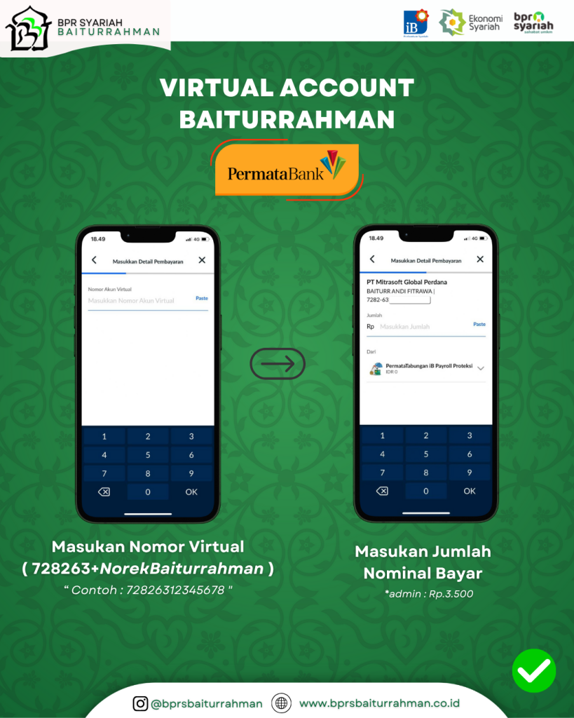 - Masukkan Nomor Virtual ( 728263+NorekBaiturrahman)*. Lalu Masukkan Jumlah Nominal Bayar**.